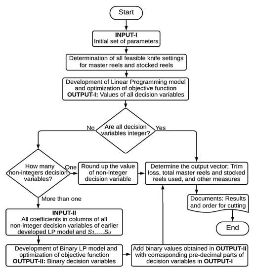 The solution procedure adopted is divided into several stages, as presented in Figure 2. First, to fill an order by setting knives to the desired widths, all feasible cutting patterns for all widths of master reels and stocked reels are generated. The cutting patterns must also be feasible in terms of operational and technological constraints. All evaluated cutting patterns are then used as columns in a linear programming model and the problem is solved using the simplex algorithm. Finally, the solution obtained is made integer if the solution algorithm results in one or more than one non-integer decision variables.