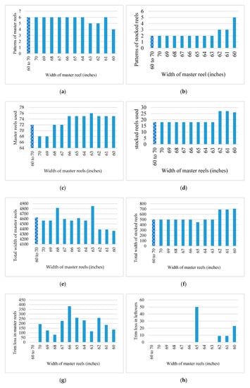 Increasing the area of master reels for cutting resulted in a decrease in the area of stocked reels and conversely decreasing the area of master reels resulted in an increase in the area of stocked reels. Thus, there is an inverse relationship between master reels and stocked reels in Case 2 and the total width of master reels selected for cutting in Case 1 was higher than some results of Case 2 as one can see in Figure 3e, while the total width of stocked reels remained same in both cases but then diverged for smaller widths of Case 2 as compared in Figure 3f.