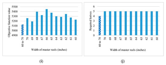 The optimal solution in Case 1 produced few over-produced reels and no trim loss. Therefore, the value of the objective function in Case 1 was less than all other values of objective function in Case 2 as presented in Figure 3i.