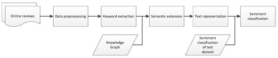 As an effective feature selection method, semantic expansion has also been widely studied. Adhi et al. [31] designed a sentiment analysis model based on a naive Bayes classifier and the semantic extension method, proving that the semantic extension method can improve the accuracy of sentiment analysis. Fang et al. [32] integrated the context features extracted from the comment sentences and the external knowledge retrieved from the sentiment knowledge graph into a neural network to compensate for the lack of available training data, consequently obtaining better sentiment analysis results. At the same time, as an effective channel for semantic expansion, knowledge bases such as WordNet and ConceptNet are widely used in sentiment analysis in multiple languages. Alowaidi et al. [33] proposed using Arabic WordNet as an external knowledge base to enrich the representation of tweets due to the weakness of the bag of words model; the use of naive Bayes and SVM on the Arab Twitter dataset verified that this external knowledge base can be used to improve sentiment analysis accuracy. Asgarian et al. [34] used Persian WordNet to generate a review corpus, proving that sentiment dictionary quality plays a key role in improving the quality of sentiment classification in the Persian language. Moreover, Agarwal et al. [35] proposed a novel sentiment analysis model based on ConceptNet and common sense extracted from context information.