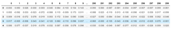 Once preprocessing and semantic expansion was complete, the comment text was typically under 300 characters in length. Therefore, googlenews-vecctors-negative300.bin [62], a word vector library of news corpora pre-trained by Google, was selected to create a comment text vector. The final results are illustrated in Figure 6. Each line in the figure is a normalized 300-dimensional Word2vec real vector, which represents a specific comment text.