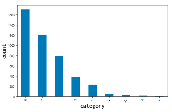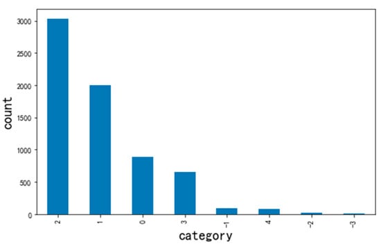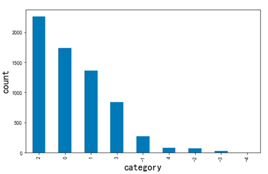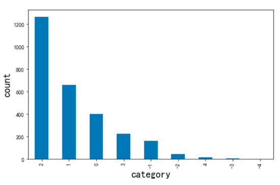 SentiStrength [68] is a software package that estimates the strength of positive and negative emotions contained in text. It also has an artificial level of accuracy for short social network texts in English. We chose the nine-level sentiment classification results provided by SentiStrength. For negative emotions, the scores range from −1 (not negative) to −4 (extremely negative); for positive emotions, moreover, the scores range from 1 (not positive) to 4 (extremely positive); 0 represents neutral emotion. In this study, the SentiStrength results were again scored by humans, and the adjustment rate was about 24.7%. Finally, the sentiment analysis results of the dataset are presented in Figure 7, Figure 8, Figure 9 and Figure 10. The abscissa represents the sentiment analysis results, which range from −4 to 4 in a total of nine categories; the ordinate indicates the number of samples in each category. It can be seen that the number of samples of each sentiment value is extremely uneven. For example, in the review dataset for the Mutianyu Great Wall in Beijing, China, the number of texts in category 2 is 1266, while there is only 1 text in category −4. Moreover, there is no category −4 data in the review data of the Sydney Opera House in Australia.