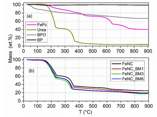 Figure 2a shows TGA curves of FePc, urea, carbon black pearls treated with nitric acid (BPO), and pristine carbon black pearls (BP). Whereas BP were thermally stable over the whole temperature range investigated, BPO had a total weight loss of 33.5% due to the splitting off of oxygen containing surface groups introduced with the treatment with nitric acid [6]. As far as urea is concerned, three main weight losses can be identified. In the first temperature region (room temperature to 230 °C), mass loss can be associated with urea decomposition to ammonium cyanate, cyanic acid (HNCO) and ammonia. As the temperature increased (230 °C–400 °C), HNCO can further react with undecomposed urea to produce different decomposition products that eventually decomposed to carbon dioxide and ammonia up to 400 °C [53].