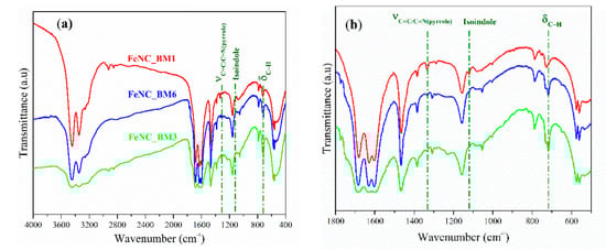 Figure 3a shows the FTIR spectrum of FeNC_BM1, FeNC_BM3 and FeNC_BM6 in a broad range of wavenumber (400–4000 cm−1), while Figure 3b shows a portion of the same spectra in a reduced range of wavenumber (500–1800 cm−1). As a general comment, the FTIR spectrum of the three catalysts showed all the vibration bands of urea, and two main contributions of FePc at 1335 cm−1 and 727 cm−1, corresponding to the C=C stretching vibration, and the Carom.-H out-of-plane bending vibration [55,56]. The FTIR spectra of FePc and urea, together with a complete assignment of all vibration bands, is reported in Figure S1 and Table S1, respectively, while the assignment of vibration band in the FeNC catalysts is reported in Table 3.