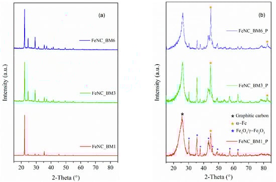 Intensity-normalized X-Ray diffractograms of (a) FeNC_BM1, FeNC_BM3 and FENC_BM6, and (b) FeNC_BM1_P, FeNC_BM3_P and FeNC_BM6_P.