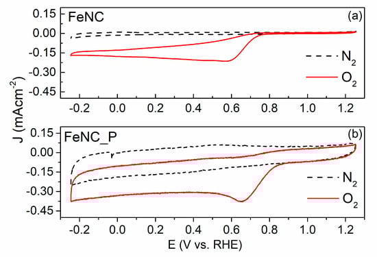 To evaluate catalytic activity toward ORR of the prepared catalysts, cyclic voltammetry was carried out in either nitrogen- or oxygen-saturated phosphate buffer. No peaks were detected in N2-saturated PBS for both FeNC and FeNC_P (Figure 5), and the resulting capacitive current was much higher for FeNC_P as compared to FeN, because an expected effect of pyrolysis in increasing surface area of the catalyst. When the electrolyte was saturated with oxygen, a well-defined reduction peak around 0.6 V vs. RHE can be seen for both samples demonstrating the occurrence of ORR at the surface of Fe-N-C catalysts. The ORR peak was shifted toward more positive voltage values for FeNC_P, pointing at the beneficial effect of pyrolysis in enhancing ORR. ORR peak current density also increased, indicating an increased density of active sites after pyrolysis.