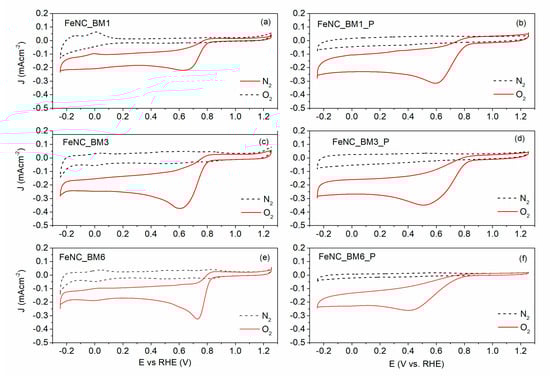 The same characterization was carried out for all the prepared electrocatalysts: The samples prepared with different ball-milling times (FeNC_BM1, FeNC_BM3 and FeNC_BM6) and the samples obtained after a further pyrolysis treatment of the above-mentioned samples (FeNC_BM1_P, FeNC_BM3_P and FeNC_BM6_P). The corresponding CV curves are shown in Figure 6.