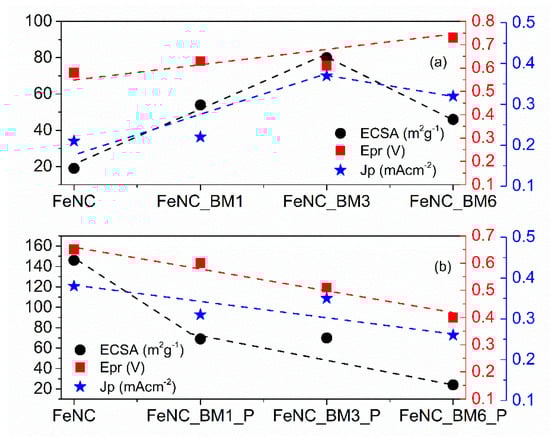 As a general comment, ECSA values changed after either ball-milling time and subsequent pyrolysis, and variations in Epr and Jpr also took place. To identify a trend in ECSA, Epr and Jp after ball-milling and pyrolysis, those parameters were plotted in Figure 7 for nonpyrolyzed (Figure 7a) and pyrolyzed catalysts (Figure 7b).