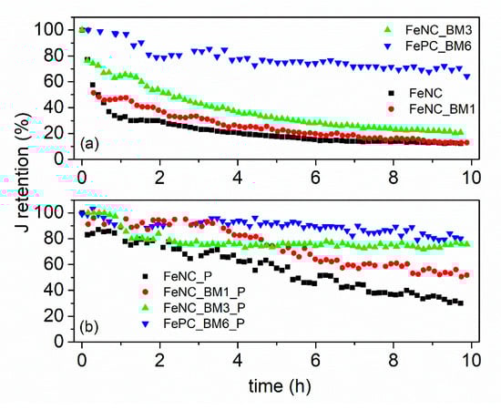 In the case of nonpyrolyzed samples (Figure 8a), current density decreased over time, and eventually reached a plateau after 8 h. On the other hand, current density retention increased in the order FeNC < FeNC_BM1 < FeNC_BM3 > FeNC_BM6, indicating that ball-milling time was very effective in enhancing catalytic stability of Fe_N_C catalysts. Table 3 lists Jretention values for all samples: 6 h of ball-milling allowed retention up to 65% of initial current density after 10 h of operation. In the case of nonpyrolyzed samples (Figure 8b), current density retention was much higher than that of the corresponding nonpyrolyzed samples. This finding points toward the beneficial effect of pyrolysis in enhancing catalytic stability, and adequate Jretention values were obtained for FeNC_BM1_P, FeNC_BM3_P and FeNC_BM6_P (50%, 75% and 80%, respectively).