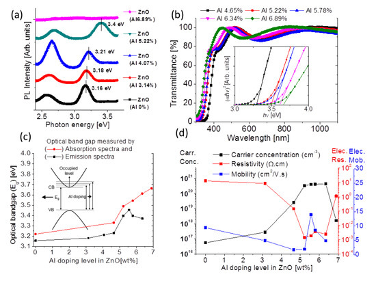 Optical and electrical properties of Al-doped ZnO (AZO). (a) Photoluminescence (PL) intensity of AZO with different Al doping (measured at room temperature, and excited by 4.4 eV). (b) Ultraviolet-Visible-Near Infrared (UV-Vis-NIR) spectra of AZOs with different Al doping. (c) Optical band gap widening, extracted from Figure 1a,b; Burstein–Moss effect was described in the inserted Figure (d) Electrical properties of AZO with different Al doping by using Hall effect measurement.