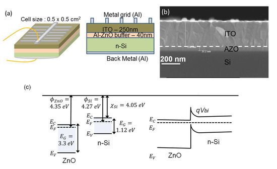 In recent researches, Al-doped ZnO (AZO)/Si heterostructures demonstrated reliable rectifying junction behaviors with improved optical absorption and current collection for enhanced photovoltaic performance [13,14]. The TCO/Si device structure could provide opportunities to overcome some challenges of conventional solar cell structures, such as the lateral component of photogenerated current reduction due to emitter layer Ohmic loss. Although such a loss could be compensated for by using a heavily doped emitter layer, it could still cause higher carrier recombination with decreased light absorption. These limitations could be addressed by using well-designed TCO/Si heterojunction device structures, attributed to the superior optical transparency and electrical conductivity of TCO materials. In addition, the device fabrication process could also be simplified compared to conventional solar cells [15]. However, a main challenge of TCO/Si devices is the relatively low open circuit voltage (Voc) and fill factor (FF) performance due to the intrinsic defects and lattice mismatch at the heterojunction interfaces [11]. Thus, improving junction interfacial qualities with higher junction built-in potential values (qVbi) is essentially important [16,17,18].