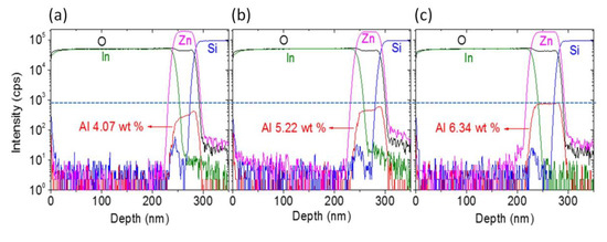 To better understand the ITO/AZO/Si structure properties, the chemical composition depth profiles of ITO/AZO/Si structures were characterized via a secondary ion mass spectrometer (SIMS). The AZO inter-layers with different Al doping concentrations were deposited via the dual-beam co-sputtering method (details in the Experimental Section). As shown in Figure 3a–c, they were prepared with the same ZnO sputtering power of 300 W, but different Al co-sputtering powers of 15, 25, and 35 W, respectively. One can see that the element distributions of In, O, and Zn were identical across samples, indicating a stable and uniform deposition condition. Due to the different Al co-sputtering powers, different signal intensities were observed, indicating different Al doping concentrations in AZO inter-layers. This demonstrated the flexible Al doping tunability in AZO thin films via the proposed dual-beam co-sputtering method. Based on the deposition rate, the Al doping in AZO inter-layers was calculated to be 4.07, 5.22, and 6.34 w.t.%, as shown in Figure 3a–c, respectively.