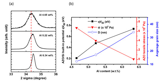 In order to understand the increased qVbi values and the related junction interface characteristics, the AZO crystallinity and the thin film residual stress were systematically investigated. In this work, the AZO thickness was relatively thin (40 nm), thus the residual stress is a significant factor of AZO thin film properties as reported [42]. As shown in Figure 4a, the AZO thin films with various Al doping concentrations (i.e., 4.65 wt%, 5.22 wt %, and 6.34 wt%) all showed XRD diffraction peak positions of 2θ around ~34.4°, indicating a preferential crystalline orientation of (002) with the c axis perpendicular to the substrates. For the AZO with Al doping of 4.65 w.t.% (as shown in the upper panel of Figure 4a), the XRD peak was at 2θ of 34.39°, which is slightly lower than the pure (002) ZnO powder value (i.e., 2θ = 34.47°). This slight deviation indicated a tensile residual stress parallel to the c axis caused by the imperfection of the AZO crystal structure and the atom impacting effects during the sputtering process. For AZO with slightly higher Al doping concentrations of 5.22 w.t.% and 6.34 w.t.% (as shown in the middle and bottom panels of Figure 4a), the peak position shifted to larger 2θ angles of 34.43° and 34.49°, respectively. This shift implied that the spacing between AZO (002) planes was shortened, and the tensile stress was reduced with the increase of Al doping. The ionic radius of Al3+ (~53 pm) is smaller than that of Zn2+ (~72 pm). When moderate Al doping atoms were introduced into AZO thin films substituting the Zn sites, the length between (002) planes was reduced with tensile stress released2. The actual residual stress (σ) of the AZO thin films can be calculated via Equations (5) and (6) as below [43]: