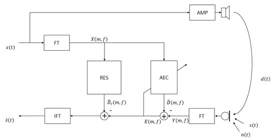 where , , , , , , and are the STFT coefficients of , , , , , , and in the frame m and frequency f, respectively. The goal of the RES is to estimate and remove the residual echo, , from the available signals, such as the far-end reference signal, , the linear echo estimate, , and microphone signals, , in the past and current frames in all frequency bins. A block diagram of an AEC system with a RES module is shown in Figure 1.