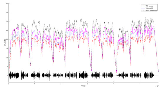 Table 1 and Table 2 show the average ERLEs in the far-end single-talk periods and average PESQ scores in the double-talk periods for the simulated data. In all noise types and echo-to-noise ratios, the HDRES [28] improved the ERLE of the linear AEC while keeping the PESQ scores the same, and the proposed RES outperformed the HDRES in both the ERLE and PESQ scores. The PESQ scores for the PFRES was similar to those for HDRES, while the ERLE for the PFRES was in the middle of that for the HDRES and that for the proposed RES. On average, the ERLE was improved by 5.37 dB compared with the linear AEC output, by 0.74 dB compared with the PFRES, and by 4.43 dB compared with the HDRES, while the PESQ scores was improved by compared with the linear AEC output, by compared with the PFRES, and by compared with the HDRES. We can conclude that exploiting the temporal correlation of the relevant signals in addition to the harmonic relation between frequency bins was effective to estimate the residual echo.