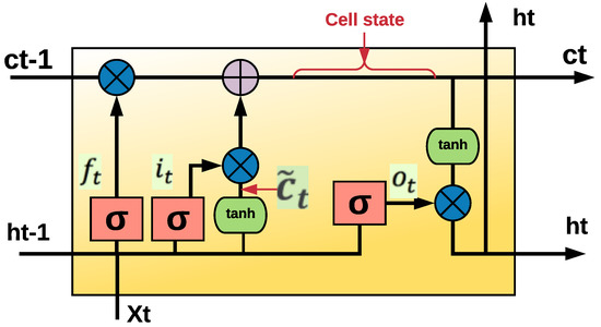 LSTM extends the memory of the Recurrent Neural Network (RNN) to learn patterns from temporal sequential data [34]. It has been used to process the sensor data collected in a smart home for human activity recognition [17,18]. Different from RNN, LSTM solves the vanishing gradient problem, which learns long-term sequences and the effect of initial dependencies in the sequence. LSTM has been widely used for the applications with temporal dependence between observations [35], such as natural language processing [36], stock market prediction [37], and speech recognition [38]. Each LSTM has three gates, which are forget, input, and output gates, which remove or add information to the cell state. The cell state is the key component to LSTMs which store and pass information between LSTMs. Figure 1 shows how the three gates are connected to the cell state and to each other. Each LSTM cell operates as a memory to erase, read, and write information based on the outcomes rendered by forget, output, and input gates, respectively. Forget gate receives both a new time step X t and the previous output h t 1 as input and renders the output using sigmoid activation function to decides what information will be kept or deleted. The information will be kept if the output of the sigmoid function is 1, while the information will be completely removed if the output of the sigmoid function is 0. Equation (1) shows how the forget gates is computed. The next step comprises two parts to specifies what new information should be stored in the cell state. Input gate is the first part and specify what new information from the current input ( X t , h t 1 ) is added to the cell state. The second part is the tanh activation function that generates C ˜ t a vector of new candidate values and could be appended to the cell state. The multiplication of these two parts will be added to the multiplication of forget gate with previous cell state to create a new cell state C t . When forget gate multiplied by the previous cell state, part of the information which was specified to be deleted earlier will be forgotten. Then the new candidate values is scaled by how much the cell state is updated using i t × C ˜ t . Equations (2)–(4) show how the input gate, new candidate values, and cell state are computed, respectively. Finally, the output gate is computed based on filtered information using two different activation function and also specify the next hidden state. First, previous hidden state h t 1 and the current input time step x t are passed into the sigmoid activation function. Next, the new updated cell state is fed to the tanh activation function. The output of sigmoid function mulitplies by the output of tanh functions to generate the next hidden state. The updated cell state and the new generated hidden state pass information to the next time step. Equations (5) and (6) show the calculation of output gate and hidden state.