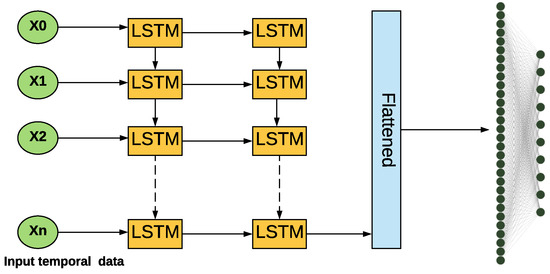 LSTM has been adopted in activity recognition applications and obtained promising results [18,20,39,40,41]. Therefore, LSTM as a temporal model is used in this study. The employed LSTM model is designed using two LSTM layers and the output of the LSTM layers is flattened and fed into a fully connected layer with ReLU activation function and followed by a softmax layer. Figure 2 shows the architecture of the LSTM model.