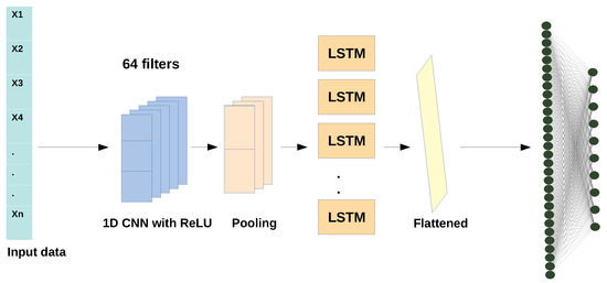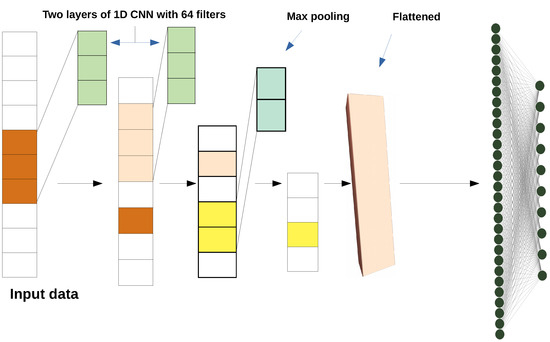 The 1D CNN model is built by employing two convolutional layers each with 64 filters, and the kernel size is equal to 3, which specifies the length of the 1D convolution window with the length of stride as 1. The feature maps of convolution layers are down-sampled by the max-pooling layer, and the size of the max pooling window is equal to 2. The outputs of the max-pooling layer are flattened and then fed into a fully-connected, i.e., a dense layer with ReLU activation function followed by a soft-max layer. Figure 3 shows the architecture of 1D CNN.
