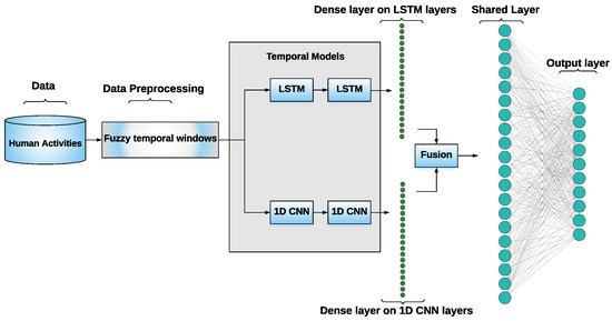 Consequently, due to the rapid increase of the number of smart home care services to monitor elderly people, deep learning for HAR systems have been more commonly employed [17,18]. Most of these systems have achieved state-of-the-art performance on various datasets of ADL [19,20]. Particularly, promising results for HAR have been achieved by two temporal deep learning models i.e., long short-term memory (LSTM), and one dimensional convolutional neural networks (1D CNN) when multiple and incremental fuzzy temporal windows are employed in order to generate input datasets to represent temporal components of human daily activities in the sensor data [17,18].