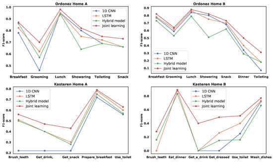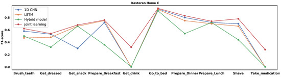 Regarding the F-score results from Kasteren datasets A, the results of the minority classes in addition to majority classes are increased using the proposed model when compared with the individual models and the hybrid model. The minority classes from home A are Brush_teeth, Get_drink, Get_Snack, Prepare_Breakfast, Take_shower, Use_toilet, those from home B are Get_a_drink, Get_dressed, Use_toilet, Brush_teeth, Eat_dinner, Wash_dishes, and those from home C are Brush_teeth, Get_dressed, Get_snack, Get_drink, Go_to_bed, Prepare_Breakfast, Prepare_Dinner, Prepare_Lunch, Shave, Take_medication, and Use_toilet. The experimental results show that the proposed joint learning of temporal models can improve the performance of minority classes besides the majority classes for human activity recognition.