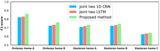 When compared with LSTM, 1D CNN, and the hybrid model, the use of our proposed model increases the F-scores by 4%, 6%, and 6% in Ordonez home A, and by 4%, 6%, and 10% in Ordonez home B respectively. Regarding to the infrequent activities Breakfast, Grooming, Lunch, showering, toileting, snack, Dinner, the proposed method improves F-scores by 4%, 8%, 3%, 7%, and 3% from Ordonez home A and by 4%, 1%, 2%, 2%, 11%, and 10% in Ordonez home B, respectively. This confirms the proposed model is capable of achieving better performance for the recognition of minority classes. When compared with LSTM, the proposed method improves F-scores by 4% from Ordonez home A, B, and Kasteren home A, as well as by 9% and 11% from Kasteren home B and C, respectively. When compared with 1D CNN, the proposed method improves F-scores by 5% from Ordonez home A, B, and by 11%, 15%, and 14% from Kasteren home A, B, and C, respectively. When compared with the hybrid model, the proposed method improves F-score by 6%, 10%, 5%, 12%, and 16% from Ordonez home A, B, and Kasteren home A, B, and C respectively.