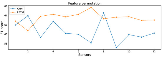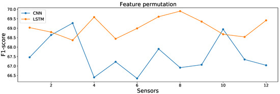 In this section, permutation feature importance (PFI) as a useful mechanism of model interpretability [58,59,60] is conducted to show more insight of each LSTM and 1D CNN independently. PFI is used to compute and rank input feature importance from Ordonez smart home A and B datasets based on how useful feature are at HAR for LSTM and 1D CNN. PFI reflects how each predictor variable is important from HAR for each LSTM and 1D CNN. Experiments that are based on PFI show that the most and least important features from both datasets are different in HAR for LSTM and 1D CNN. This indicates the most important features in recognition process varies between LSTM and 1D CNN, which has been considered to take advantage of most important features in both models in the proposed joint learning. Hence, the proposed joint temporal model exposes different features from input data into the joint learning to improve the performance of HAR particularly minority classes given the different rank of the important features from both models. The rank of features in LSTM and 1D CNN based on the PFI is different, which is indicative of how much each LSTM and 1D CNN models relies on the features. This illustrates that the joint proposed model takes feature importance in both models into account in the joint learning. Therefore, the joint learning can use a set of the most important features from one model and a different set from the other model to contribute in the recognition to generally improve the performance of HAR particularly minority classes. Algorithm 2 designed based on [60,61] shows the process of PFI in detail. Firstly, the result scores, i.e., F1-score of each LSTM and 1D CNN, are computed. Next, a single feature from the dataset is randomly shuffled to generated a permuted version of the dataset. This mechanism removes the relationship between the features and the true labels. Subsequently, the LSTM and 1D CNN models are independently applied on the permuted version of the dataset to compute the result score. Finally, we subtract the result score based on permuted data from the result score of the original data. This mechanism measures features’ importance by computing the error of the LSTM and 1D CNN after permuting the feature. Moreover, after applying permutation on a feature, the decrease of the f1-score indicates the model depedency on the permuted feature. This mechanism is applied on all of the features to compute feature importance. Table 7 and Table 8 show PFI on the Ordonez smart homes A and B datasets and the rank of the importance of each feature. Further, the value of mean and standard deviation of the F1-score for N runs after permuting the feature are presented. Figure 10 and Figure 11 show the mean results of f1-score with N = 12 run for 12 sensors after permuting the sensor features.