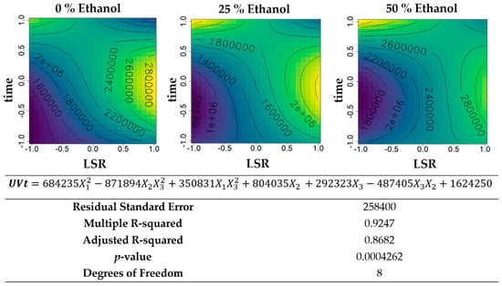 Contour plots of the modelled function regarding the UV absorbance (per gram of extract) obtained during the first optimization of Grateloupia turuturu hydroethanolic SLE using a Box–Behnken design, in the presence of different concentrations of solvent (ethanol). For each plot, XX axis indicates the LSR and YY axis indicates extraction time. Color gradients represents the increase (yellow color) and decrease (blue color) in UV absorbance according to the tested variables. Below, the equation and goodness-of-fit statistical parameters for the variable UV absorbance (mL·cm−1·g−1 extract) in the first optimization process, according to the ethanol concentration (X1), (X2), and extraction time (X3) are presented.