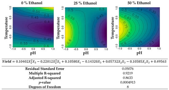 Contour plots of the modelled function regarding the yield obtained during the second optimization of Grateloupia turuturu hydroethanolic SLE using a Box–Behnken design, in the presence of different concentrations of solvent (ethanol). For each plot, XX axis indicates the pH and YY axis indicates temperature. Color gradients represents the increase (yellow color) and decrease (blue color) in yield according to the tested variables. Below, the equation and goodness-of-fit statistical parameters for the variable yield (g extract·g−1 biomass) in the second optimization process, according to the ethanol concentration (X1), temperature (X2), and pH (X3) are presented.