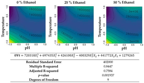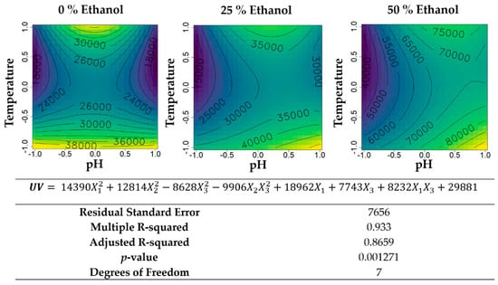 Contour plots of the modelled function regarding the UV absorbance (per gram of extract) obtained during the second optimization of Grateloupia turuturu hydroethanolic SLE using a Box–Behnken design, in the presence of different concentrations of solvent (ethanol). For each plot, XX axis indicates the pH and YY axis indicates temperature. Color gradients represents the increase (yellow color) and decrease (blue color) in UV absorbance according to the tested variables. Below, the equation and goodness-of-fit statistical parameters for the variable UV absorbance (mL·cm−1·g−1 extract) in the second optimization process, according to the ethanol concentration (X1), temperature (X2), and pH (X3) are presented.