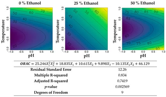 Contour plots of the modelled function regarding the ORAC activity (per gram of extract) obtained during the second optimization of Grateloupia turuturu hydroethanolic SLE using a Box–Behnken design, in the presence of different concentrations of solvent (ethanol). For each plot, XX axis indicates the pH and YY axis indicates temperature. Color gradients represents the increase (yellow color) and decrease (blue color) in ORAC activity according to the tested variables. Below, the equation and goodness-of-fit statistical parameters for the variable antioxidant activity by ORAC method (µmol TE·g−1 extract) in the second optimization process, according to the ethanol concentration (X1), temperature (X2), and pH (X3) are presented.