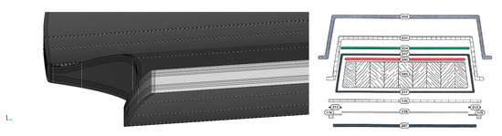 Figure 3 shows the schematic layout of the three-point-bending test. In the virtual model, just half of the structure was simulated, taking advantage of the symmetry. Moreover, the tail and the tip of the ski were not modeled to simulate only the part of the component that falls within supports. Due to their very low-resistant contribution and their very small section, the steel edges were considered negligible and were not modeled as well. A multilayered shell approach was used. The ski was divided into 145 sectors to achieve a good approximation of the curvature of the ski—this ensured a good reproduction of the effective thicknesses along the whole ski. The final grid consisted of about 22 k quadrangular elements. Figure 4 shows the 2D model of the ski.