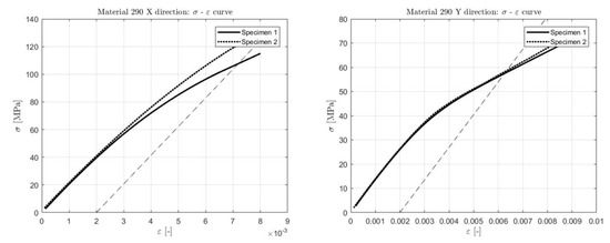 For its nature, the ski works in the elastic field only. Plastic deformations should be avoided. Therefore, during the experimental measurements, the constitutive law was characterized up to the yielding only. Most of the tested materials showed a good repeatability in the results. In some cases, due to low availability of materials, only one specimen was tested. Repetitions were possible for material 207 (both directions), 290 (both directions), 139 (X direction), and 9 (X direction). The discrepancies between repetition were very small, confirming the correct configuration of the testing setup and adequacy of the measuring devices. Materials #207 and #9 showed the same behavior in both directions. The tests performed on material #135 and #31, in which the single fibers were easily visible, were performed with a special sample with a rectangular geometry instead of a dog-bone-shaped one. After measuring the thickness and width of a single fiber, the resistant area was computed by multiplying the area of a single fiber by the total number of fibers of each specimen.