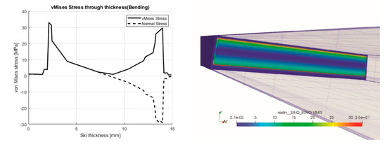 Figure 14 shows the normal stresses in the thickness of the ski (on the symmetry plane and the position where the load was applied—0 corresponds to the bottom part) during the three-point-bending test. Figure 15 refers to the bending-torsion test.