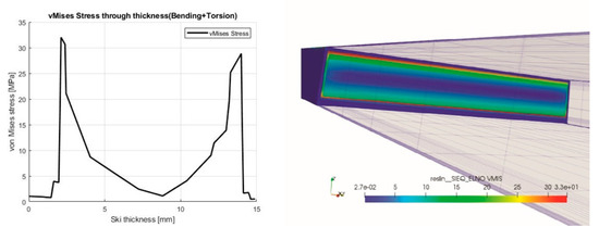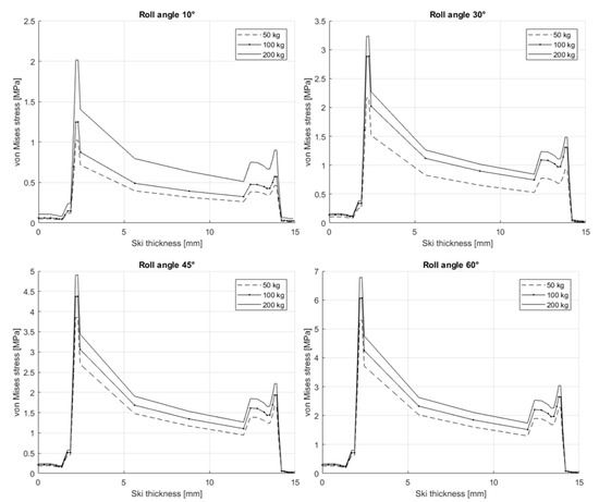 Figure 21 shows the von Mises stress in the cross-section of the ski for different roll angles and loads. Differently from what was observed during the three-point-bending and torsion-bending tests, the interaction with the snow prevented big deformations and the maximum stress level results were far below the yielding for each layer.