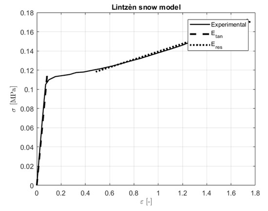 To study the behavior of the ski during a downhill turn, the ski–snow interaction had to be modeled. For doing this, the Lintzèn [19] model of snow was used. It is based on experimental compression tests on big frozen snow cylindrical samples. Lintzèn came up with a relation that described the snow as a piece-wise linear function as shown in Figure 16. The snow was characterized by an initial linear behavior in which the elastic constant assumed a value that varied between Etan = 115 (old snow) and Etan = 160 MPa (artificial snow). For higher strains, the behavior could be still described with a linear relation in which elastic module assumed a value between Eres = 9 and Eres = 35 MPa.