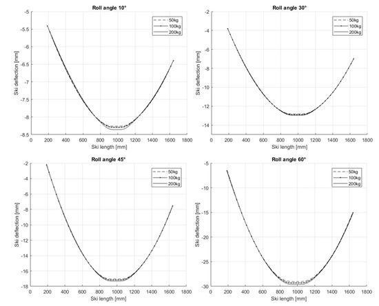 Deflection of the ski for different roll angles and 200 kg.