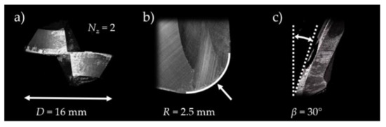 A bull-nose end milling tool with a tool diameter D, helix angle β, and tooth Nz, is defined by corner radius R (also called the ball radius). The bull-nose end mill used was purchased from 3G tool supplier and the main geometry characteristics described earlier were measured with an Alicona microscope model InfiniteFocusG5 (Alicona Imaging GmbH, Pforzheim, Germany) together with a 2.5X objective. As illustrated in Figure 1, optical microscope photographs confirm a tool diameter of 16 mm and a nose radius of 2.5 mm.