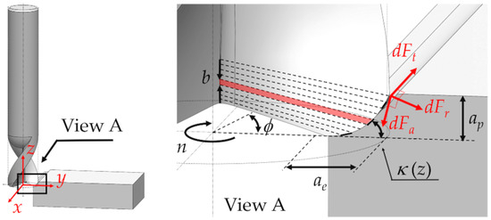 Here, is the feed rate per tooth and κ is the cutting-edge angle for a given axial slice. By means of a rotation matrix, it is possible to transform the differential cutting forces to Cartesian coordinates