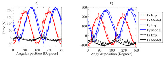In order to validate the proposed model, slot milling tests were performed. Figure 4 shows the comparison between the proposed cutting force-fitted model and experimental forces for two sets of cutting conditions. The accuracy of the proposed model to fit experimental data is shown in Figure 4; it is evident that in both cases, the proposed forced model predicts the experimental data well.