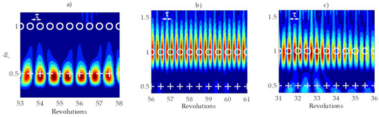 From Figure 6, three cutting tests that describe typical stable/unstable behavior have been selected (points A, B, and C). Point A describes unstable period-doubling chatter, Point B describes stable cutting conditions, and Point C describes unstable double periodic. Since the CWT analysis allows us to observe how frequencies evolve in the time domain, then this analysis was applied to accelerometer data as shown in Figure 7a–c. To relate the detected frequency in relation to the excitation, the following normalized frequency is introduced: