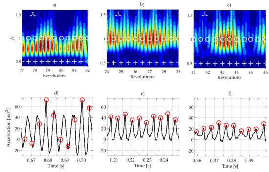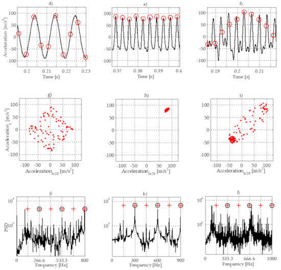 In Equation (19), represents the wavelet transform frequency and represents the tooth passing excitation frequency. The overlapped circles and cross white marks in Figure 7a–c identify normalized frequencies of and , respectively. In Figure 7d,e, the acceleration sampling (red circles) denotes vibration amplitude when the cutting tool hits the workpiece. Poincare diagrams (Figure 7g–i) were constructed with the acceleration sampling data versus 20-delayed samples. The power spectral density (PSD) in Figure 7j–l describes the power density from the acceleration data in the frequency domain.