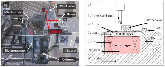 The experimental setup is implemented as shown in the optical photograph (Figure 8a). This system uses the same components described in Section 3.2, but now, it also includes the semi-active MR damper device. The MR damper device is a pool-like container or chamber fabricated in acrylic material; a non-magnetic material avoids reducing the magnetic flux density generated by an electromagnet. The acrylic chamber contains the magnetorheological fluid with an internal diameter of 200 mm and 19 mm height. In order to avoid spills, an acrylic plate is placed covering the area not in contact with the beam. The MR damper assembly is supported with 3D-printed columns so that an electromagnet could be placed between the worktable and the MR damper. An HP/Agilent power supply, model 6032A was connected to a electromagnet, model VEM200 (Electroimanes NAFSA, Gernika, Spain), which accepts a maximum input current of 3.4 A at 25 V. Once the electromagnet is energized independently of the machining, it generates a magnetic flux density that changes the yield stress of the MR fluid. The chamber was fully filled with an MRF-122EG MR fluid (LORD Corporation, Cary, NC, USA).