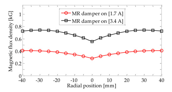 For this experimental setup, to validate the effectiveness of the MR damper device, a new cantilever beam made of aluminum alloy 7075T6 was designated with dimensions of 103 × 127 × 12.7 mm to induce specific modal parameters and study the stability boundaries of thin walls with a very low critical depth value (below 0.5 mm). In order to evaluate the effects of the MR damper over the stability boundaries, three levels of MR damper performance were studied: highest, 3.4 A; medium, 1.7 A; and lowest, off. The magnetic flux density produced by the electromagnet was measured experimentally with an F.W. BELL gaussmeter, model 5170. Figure 9 shows the magnetic flux density measured from the center of the cylindrical electromagnetic outwards along the radial direction. As expected, the magnitude of the magnetic flux density is almost constant in the radial direction, and the magnitude is proportional to the supplied electrical current. Measurements after 40 mm were not considered, since the cantilever beam was not in contact with the MR fluid.