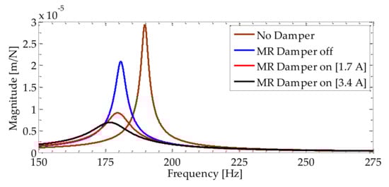 Notice from Table 4 that the natural frequency of the beam, without a damper, is 190 Hz and the damping ratio is 0.007. When MR fluid is in contact with the thin floor and off, the natural frequency shifts to 180 Hz, and the damping ratio increased by about 50%. Note that when the MR damper is off, the electromagnet is not active, and no electrical current is provided, but it is still in contact with the cantilever beam and the FRF is affected. Table 4 shows that if the MR damper is turned on and subjected to two electrical currents values, the damping ratio of the system increases proportionally. The damping of the system depends on the yield stress of the magnetorheological fluid, which can be estimated by using the technical data sheet from the fluid manufacturer [38].