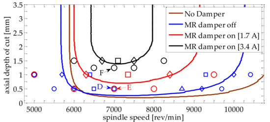 Stability lobes diagrams for three scenarios of magnetic flux density applied to the MR damper device together with experimental data in a down-milling operation. (○ stable cut, □ quasi-periodic chatter, Δ double periodic chatter, and ◊ border cutting parameters).