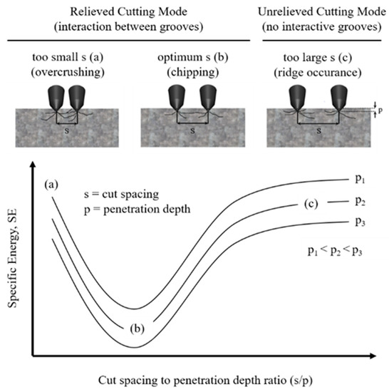 The specific energy is influenced by the cut spacing, and it is minimized at a specific cut spacing. In mechanical rock excavation, the breakage of rock occurs due to the interaction between the adjacent cutters. Figure 3 shows that, if the spacing between adjacent pick cutters is too small, the adjacent pick cutters cannot make significant rock chips. If the spacing between them is too large, they do not make any rock chips. The interaction between adjacent cutters determines whether the cutting mode is relieved or unrelieved. In the relieved cutting mode, the interaction occurs between the cutters, i.e., the cut spacing is small or optimum, whereas in the unrelieved cutting mode, there is no interaction between the cutters, i.e., the cut spacing is large.