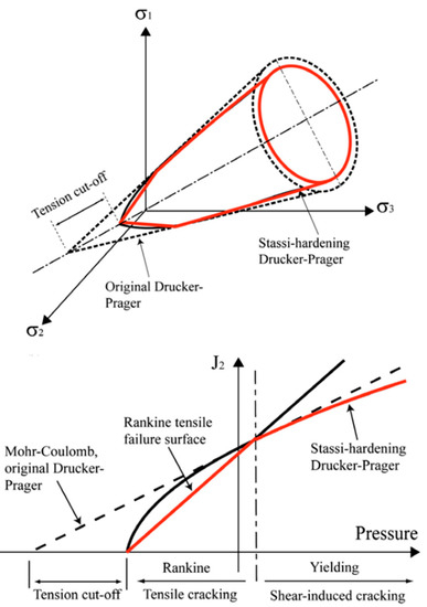 Various strength models have been used to simulate the rock cutting process in previous studies. The function of the yield stress of a material was determined by the strength model in AUTODYN. The Drucker–Prager (DP) strength model (Figure 6) is suitable for elasto-plastic materials such as rock [32]. Moreover, the applicability of the DP strength model in rock cutting simulation has been shown in previous studies [6,9,11,33,34,35]. Because it is a linear function, the DP model was converted to the non-linear Stassi-hardening function [36] to describe the brittle behavior that is significantly weaker in tension than in compression during fragmentation of rock cutting [9]. In this study, the yield strength under tensile stress was assumed to be 90% of the Brazilian tensile strength of rock, and yield strength under compressive stress was assumed to be 90% of the uniaxial compressive strengths of rock. Tension cut-off level is determined on the basis of the tensile strength of rock. In Figure 6, on the left hand side of the intersection between the Rankine and Stassi-hardening functions, tensile yielding is dominant; on the right hand side, shear yielding is dominant [9].