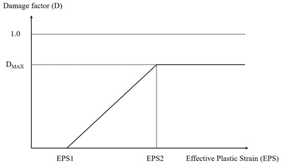 The CD model computes a damage factor (D) to model the progressive crushing and subsequent weakening of materials. Equation (5) and Figure 7 show that the damage factor is zero for cases of plastic deformation in which the effective plastic strain (EPS) is less than a certain value, i.e., EPS1. When the strain reaches the value of EPS1, the damage factor increases linearly with the strain up to a maximum value of DMAX (<1), which is the value of the effective plastic strain, i.e., EPS2 [16].