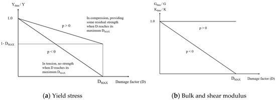 If the hydrostatic pressure is negative (tension), the reduced yield strength is defined as in Equation (7), and these reduced functions are presented in Figure 8a. In the same manner as the yield strength, the bulk and shear modulus are also reduced to Kdam and Gdam, respectively, on the basis of the level of damage factor. They are unaffected by compression, but during tension they are progressively reduced to zero when the damage is maximized. Thus, during tension, they are both reduced by the damage factor (Figure 8b). The cutting process of rock involves the combined behavior of compressive and tensile stresses. The characteristics of the materials used in the CD model are suitable for simulating the combined behavior under the stresses in the rock cutting process.