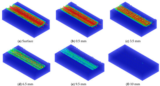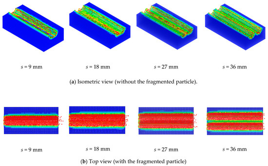 Figure 14 shows the contour of damage of the cut surface for the rock model at different heights (p = 5 mm and s = 20 mm). The term “height” refers to the distance from the surface of a rock model. The crack in the vertical direction propagated up to 10 mm from the surface (as represented by the range of the damaged particles) when the pick cutter penetrated 5 mm. The cracks ranged from 10 mm to 24 mm with changes in penetration depth. Geng et al. [11] noted that the FEM numerical models might need improvements in terms of the reality and accuracy; in the traditional FEM simulations, the rocks beneath the cutter tip usually cut off excessively in the vertical direction, while the chipping of the rocks between the cut spacing is usually less than real situation. This may be because that the plastic hardening and failure in different parts of the rock specimen are usually considered the same by assigning one function of the equivalent stress versus plastic strain for elastic–plastic mechanics of continuous materials. In this study, as described in Figure 8, the rock was modelled to behave according to different functions under compression (beneath the cutter tip) and tensile (chipping between adjacent cut lines) stresses. The results of rock fragmentation in numerical simulation indicated that the different behavior of the rock under compression and tensile stress was adequately simulated. It is noteworthy that the extent of cracking might depend on the both penetration depth of the pick cutter and the particle size of the rock model.